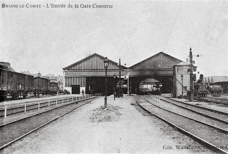 Reproductie van een postkaart met als opschrift 'Braine-le-Comte - L'Entrée de la Gare Couverte' en als uitgever 'Edit. Wattelaine, Braine-le-Comte'. De postkaart toont de dubbele perronoverkapping van het station. Links staan gesloten goederenwagens opgesteld. Ook zien we de achterzijde van twee mechanische seinen, een verhoogde seinpost en een stoomlocomotief. Voor de verlichting van de perrons worden petroleumlantaarns gebruikt. Om de stabiliteit van de sporen te verzekeren zijn de dwarsliggers tussen de rails met ballast bedekt.
