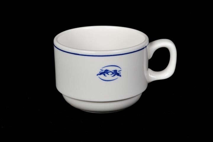 BeschrijvingWitte kop met een blauwe bies en het logo van de Compagnie des Wagons-Lits (gestileerd wapenschild met twee leeuwen).