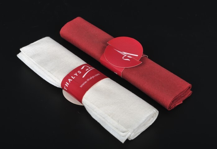 BeschrijvingRode papieren servetring met het Thalys-logo en het webadres. In de ring zit een rode of witte servet.