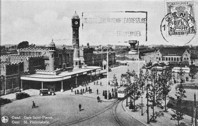 Reproductie van een postkaart met als opschrift 'Gand Gare Saint-Pierre. Gent St. Pietersstatie.' Het logo van de uitgever gaat het opschrift vooraf. Bovenaan rechts staat een afgestempelde postzegel met de boodschap 'De zegels plakken op de adreszijde... rechterbovenhoek'. De postkaart toont de voorgevel van het station met zijn luifel, kantelen, torentjes en uurwerktoren. Reizigers nemen een tram in de richting van het stadscentrum. Aan de in- en uitgang van het station staan auto's geparkeerd. Voor het postgebouw staan twee autobussen. Op de achtergrond zien we een watertoren voor de bevoorrading van de stoomlocomotieven.