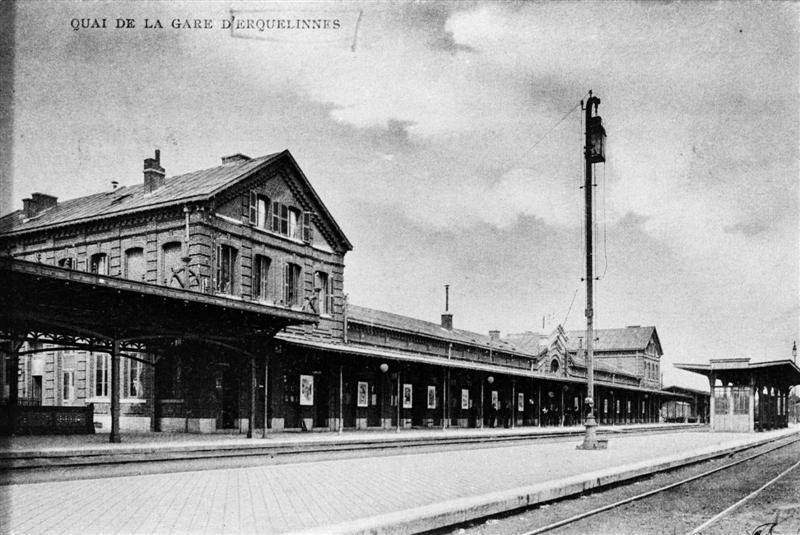 Reproductie van een postkaart met als opschrift 'Quai de la Gare d'Erquelinnes'. De postkaart toont de zij- en achtergevel van het grensstation met luifel. Op het middenperron staat een luifel en een paal met een elektrische lamp. Om de stabiliteit van de sporen te verzekeren zijn de dwarsliggers met ballast bedekt.