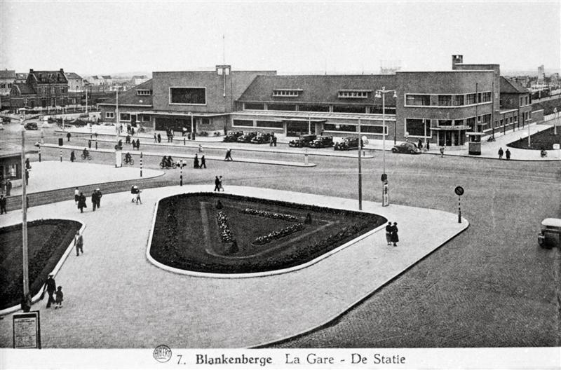 Reproductie van een postkaart met als opschrift '7. Blankenberge La Gare - De Statie'. Voor het opschrift staat het logo van de uitgever. De postkaart toont de voor- en zijgevel van het tweede station in modernistische stijl. Voor het gebouw staan auto's geparkeerd. Voetgangers steken de baan voor het station over. Het stationsplein is met bloemperken aangelegd.