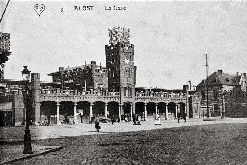 Reproductie van een postkaart met als opschrift '3. Alost La Gare'. Voor het opschrift staat het logo van de uitgever. De postkaart toont de voorgevel van het station met zijn kantelen, uurwerktoren en galerij. Achter het gebouw zien we een opgehoogd perron met luifel. Op de uurwerktoren staat een telefoon- en telegraafmast. Over het stationsplein verplaatsen zich voetgangers. Links zien we op de hoek van een van de zijstraten een gaslantaarn.