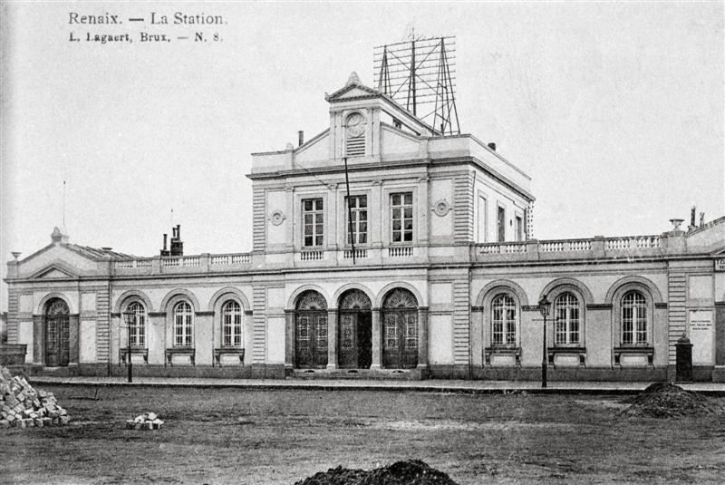 Reproductie van een postkaart met als opschrift 'Renaix. - La Station. ' en als uitgever 'L. Lagaert, Brux. - N. 8.' De postkaart toont de voorgevel van het station in neoclassicistische stijl. Het gebouw stond oorspronkelijk in Brugge op het Zand. Het werd steen voor steen gedemonteerd en heropgebouwd met de oorspronkelijke voorgevel naar de sporen. Op het dak staat een telefoon- en telegraafmast. Het stationsplein is volop in aanleg.
