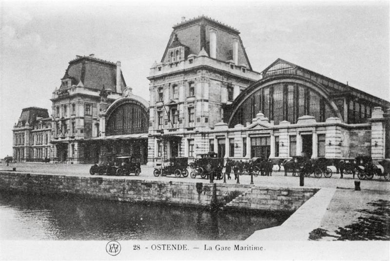Reproductie van een postkaart met als opschrift '28 - Ostende - La Gare Maritime.' Voor het opschrift staat het logo van de uitgever. De postkaart toont de voorgevel van het station met overkapte aankomsthal. Voor het gebouw en langs de kade staan auto's en paardenkoetsen opgesteld.