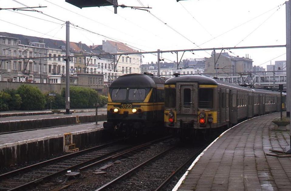 Diesellocomotief 5923 en motorstel 137 in Brussel-Leopoldswijk