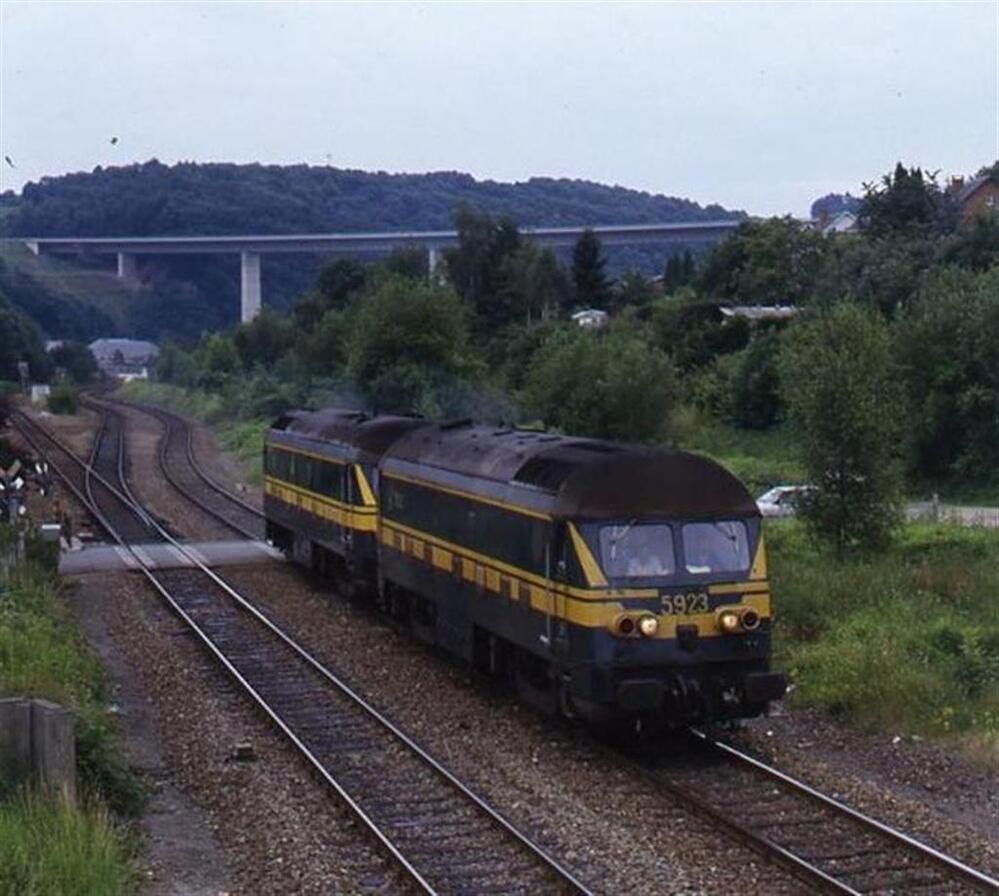 BeschrijvingWe zien twee diesellocomotieven van de reeks 59 die in dubbeltractie rijden op volle baan. De locomotieven zijn net een overweg voorbijgereden.