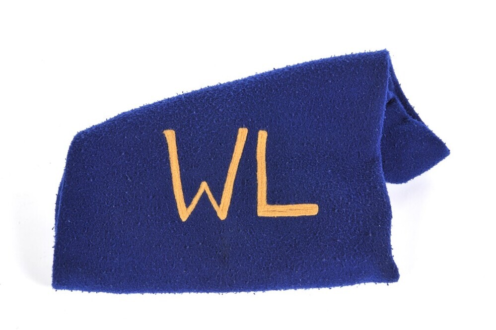 BeschrijvingDonkerblauw deken waarop in gele letters 'WL' staat.