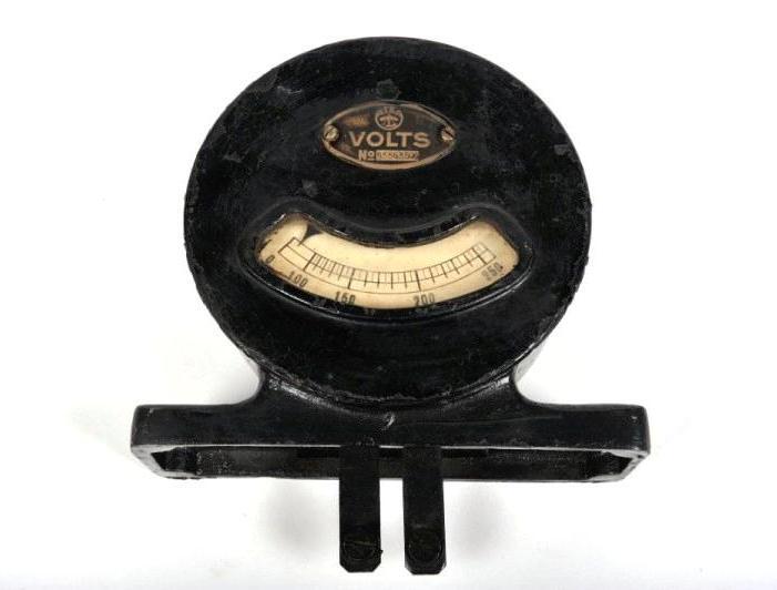 BeschrijvingDeze zwarte voltmeter werd gebruikt om elektrische spanning te meten. De wijzerplaat bevindt zich achter een glazen schermpje en gaat van 0 tot 250 volt. Onderaan bevinden zich stangen waarmee het instrument permanent kon worden vastgezet in het te meten circuit.