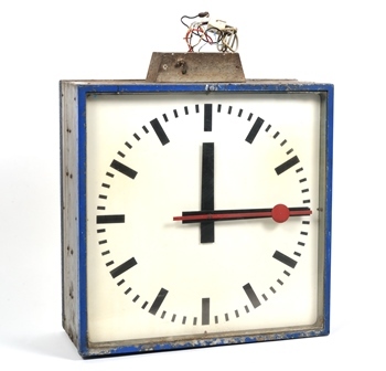 Deze elektrisch aangedreven klok heeft aan beide kanten een wijzerplaat. Er staan geen getallen op de wijzerplaat. De wijzers zijn sober en zwart, behalve de secondewijzer die rood is en op een cirkel eindigt. De rand van de klok is donkerblauw geverfd.