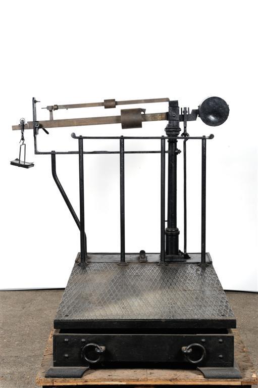 BeschrijvingZwarte weegschaal met een grote voetplaat om de bagage op te plaatsen. Bovenaan een stang met inscripties van gewichten (tot 1000 kg), waarover het gewicht geschoven werd om een juiste meting te verkrijgen.
