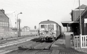 BeschrijvingDeze motorwagen behoort tot de reeks 45. Rechts zien we het station met aangebouwde luifel.