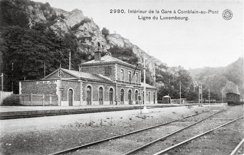 Reproductie van een postkaart met als opschrift '2980. Intérieur de la Gare à Comblain-au-Pont Ligne du Luxembourg.' Achter het opschrift staat het logo van de uitgever. De postkaart toont de zij- en achtergevel van het station. Voor de verlichting van het perron worden elektrische lampen gebruikt. Op een zijspoor staan goederenwagens opgesteld. Om de stabiliteit van het spoor te verzekeren, zijn de dwarsliggers met ballast bedekt. Op de achtergrond zien we de rotswanden van de vallei van de Ourthe.