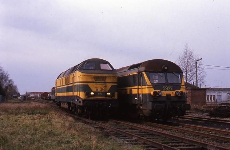 Een diesellocomotief van de reeks 59 staat in Baasrode. Op het naastliggende spoor zien we een diesellocomotief van de reeks 61. Sinds 1986 wordt spoorlijn 52 uitgebaat door de v.z.w. 'Belgische vrienden van de stoomlocomotief' (BVS), sinds enkele jaren omgedoopt tot v.z.w. Stoomtrein Dendermonde - Puurs. Schenking van Myriam Hendrickx.