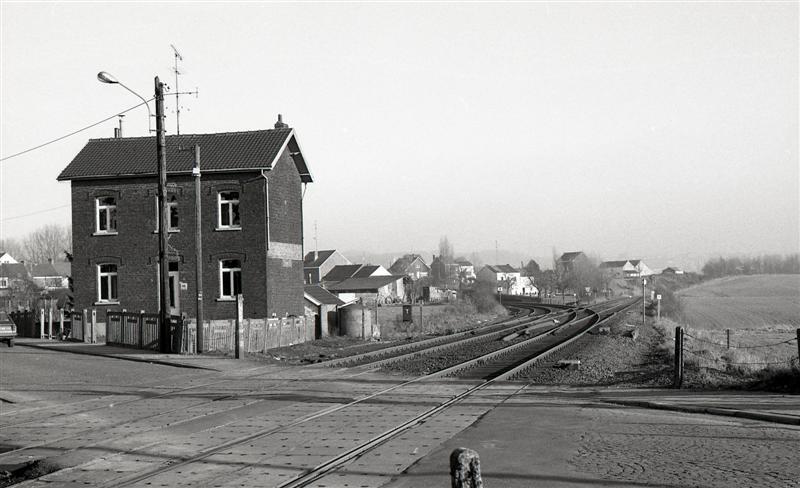 Op de voorgrond zien we een overweg en links naast de sporen staat een overwegwachtershuisje. Dit huis werd destijds bewoond door de bediende die verantwoordelijk was voor het bedienen van de slagbomen van de overweg. In de achtergrond zien we de splitsing van lijn 108 en lijn 112. Schenking van Myriam Hendrickx.