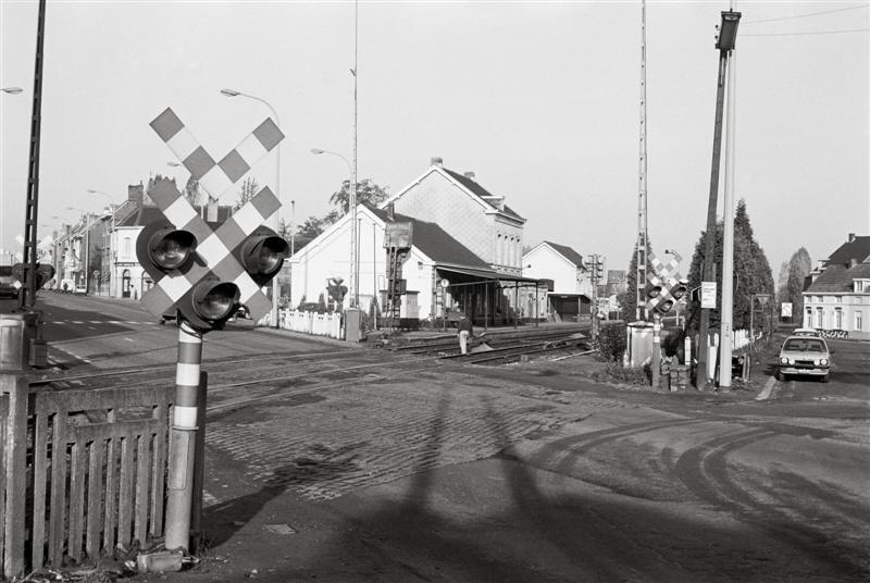 Deze foto toont de overweg naast het station. Op de voorgrond zien we een andreaskruis met drie knipperlichten. De slagbomen zijn geopend.