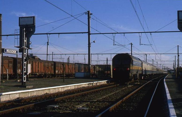 Deze fotogroep bevat zes dia's. Een diesellocomotief van de reeks 59 is met een internationale trein aangekomen in het station. We zien de perrons, een stationsnaambord, een schuilhuisje en een lichtsein. Op de achtergrond staan een aantal gesloten goederenwagens. Op de laatste foto zien we een diesellocomotief van de reeks 59 tijdens een rangeerbeweging. Schenking van Myriam Hendrickx.