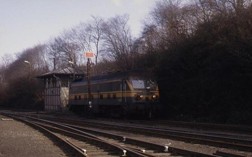 Deze fotogroep bevat zes dia's. Een diesellocomotief van de reeks 59 is aan het rangeren waarbij op enkele foto's het houten seinhuis en de mechanische seininrichting in beeld worden gebracht. Op de tweede foto zien we een diesellocomotief van de reeks 59 voor een lange sleep tremelwagens in de sporenbundel. Links en rechts staan eveneens een lange rij tremelwagens te wachten op een volgende opdracht. Schenking van Myriam Hendrickx.