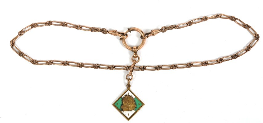 Deze ketting diende om een zakhorloge aan te dragen. Er hangt een ruitvormig medaillon aan, verdeeld in vier vlakken: twee witte en twee groene. Centraal in relief staat een stoomlocomotief. Rondom in wijzerszin de letters 'S N B A' (Société Anonyme Nord-Belge).