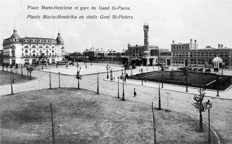 Reproductie van een postkaart met als opschrift 'Place Marie-Henriette et gare de Gand St-Pierre. Plaats Maria-Hendrika en statie Gent St-Pieters.' De postkaart toont de voorgevel van het station met zijn luifel, torentjes, kantelen en uurwerktoren in neogotische stijl. Links zien we een gebouw waar de gewestelijke diensten van de NMBS gehuisvest zijn. Oorspronkelijk was het een hotel opgericht naar aanleiding van de Wereldtentoonstelling te Gent in het begin van de twintigste eeuw. Voor het station is een bloemperk aangelegd. Voor de straatverlichting worden gaslantaarns gebruikt. Op het plein staan een stadstram en meerdere paardenkoetsen opgesteld.