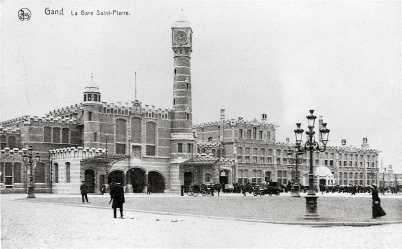 Reproductie van een postkaart met als opschrift 'Gand. La gare Saint-Pierre.' Voor het opschrift staat het logo van de uitgever. De postkaart toont de voorgevel van het station met zijn kantelen, torentjes, luifel en uurwerktoren in neogotische stijl. Over het plein verplaatsen voetgangers zich in alle richtingen. Voor het station staan een auto en paardenkoetsen opgesteld. Voor de verlichting van het plein worden gaslantaarns gebruikt.
