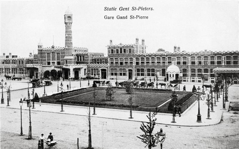 Reproductie van een postkaart met als opschrift 'Statie Gent St-Pieters. Gare Gand St-Pierre'. De postkaart toont de voorgevel van het station met zijn kantelen, torentjes, luifel en uurwerktoren in neogotische stijl. Op de voorgrond zien we twee vrouwen met een kinderwagen. Voor het station is een bloemenperk aangelegd. Op het plein staan paardenkoetsen. Voor de verlichting van het plein worden gaslantaarns gebruikt.