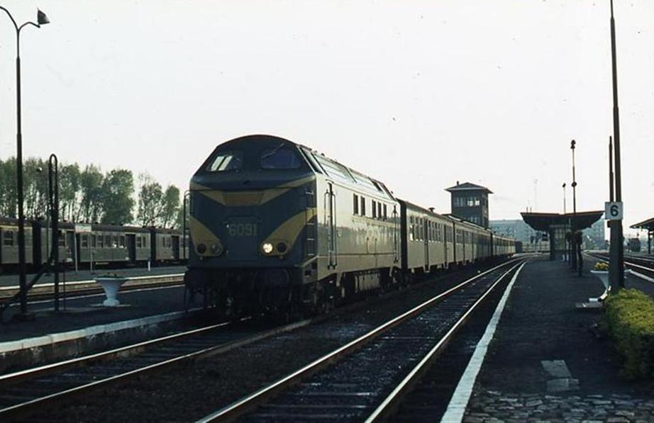 Een diesellocomotief van de reeks 60 is aangekomen in station Dendermonde met een reizigerstrein samengesteld uit M 2-rijtuigen. De locomotief is groen geschilderd met gele zichtbaarheidsstrepen. We hebben zicht op de perrons, de verlichting, een luifel en enkele bloembakken. Links naast de locomotief staat een waterpomp om diesellocomotieven die de rijtuigen op stoom verwarmen van water te voorzien. Op de achtergrond zien we enkele M 1-rijtuigen. Schenking van Myriam Hendrickx.