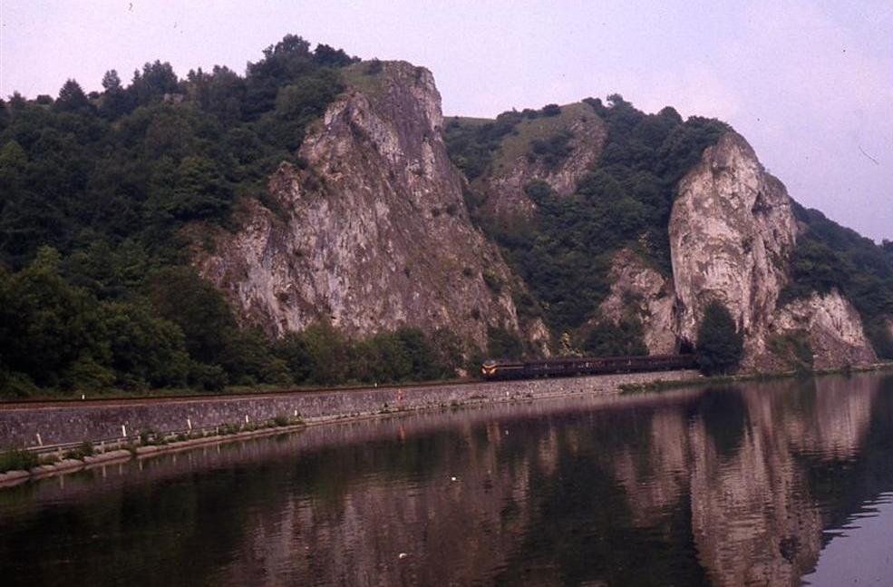 BeschrijvingEen diesellocomotief van de reeks 60 rijdt met een aantal K- rijtuigen langs de oever van de Maas.