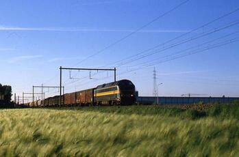 BeschrijvingDeze fotogroep bevat vijf dia's. We zien een diesellocomotief reeks 60 met een gemengde goederentrein op volle baan.