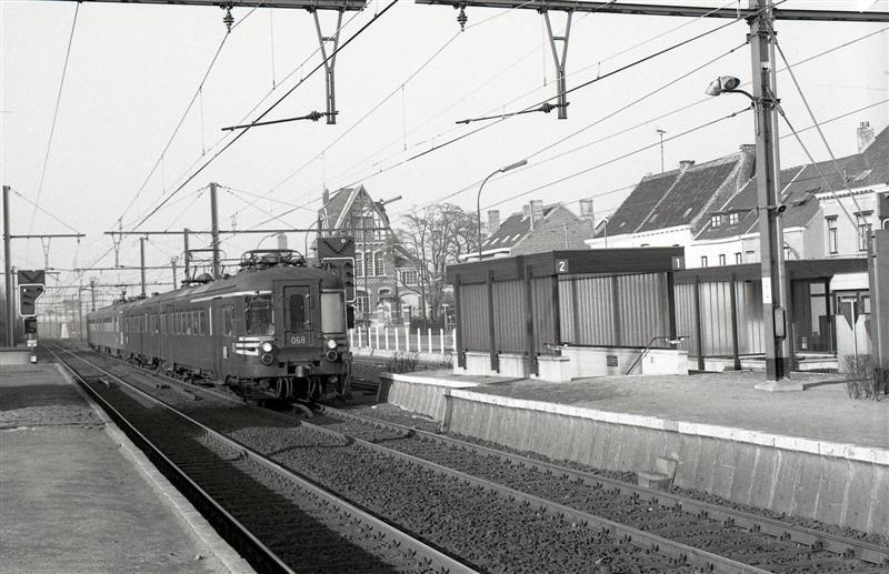 Dit motorstel behoort tot de reeks 00 schijf 1954. Rechts zien we de toegang tot de onderdoorgang met daarop spooraanduidingen. Links zien we aan het einde van het perron een stopsein van het type II.