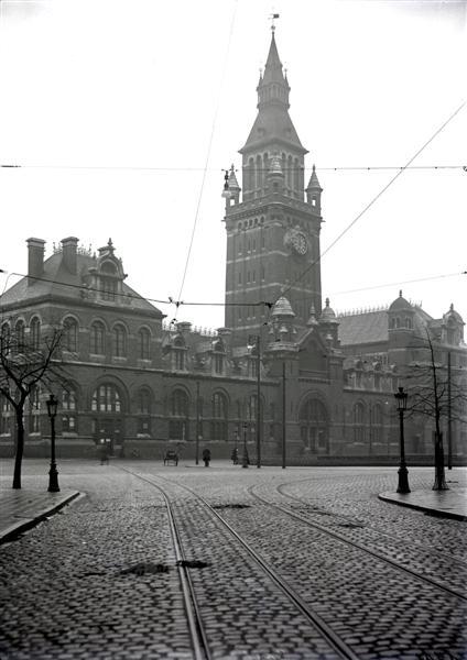 Deze foto toont de buitenzijde van het kopstation met zijn neoromaanse uurwerktoren. De tramsporen liggen ingebed tussen de kasseistenen op het plein voor het station. Voor de straatverlichting worden elektrische lampen en gaslantaarns gebruikt. Boven de sporen hangt de bovenleiding van de stadstram.