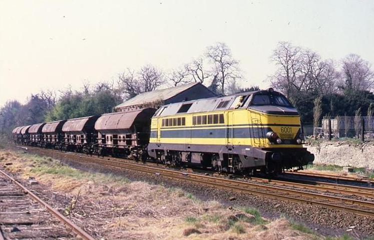 BeschrijvingEen diesellocomotief van de reeks 60 proto sleept een goederentrein samengesteld uit tremelwagens.