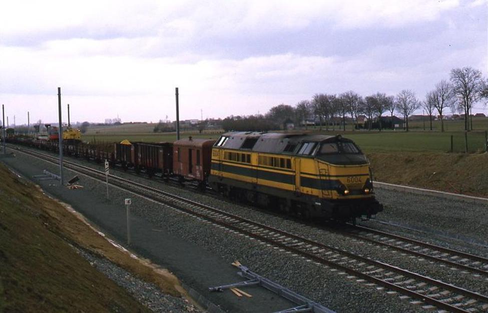 We zien een werktrein gesleept door een diesellocomotief van de reeks 60 proto. De elektrificatiewerken zijn volop bezig: de sporen zijn reeds vernieuwd en de eerste bovenleidingmasten werden geplaatst.