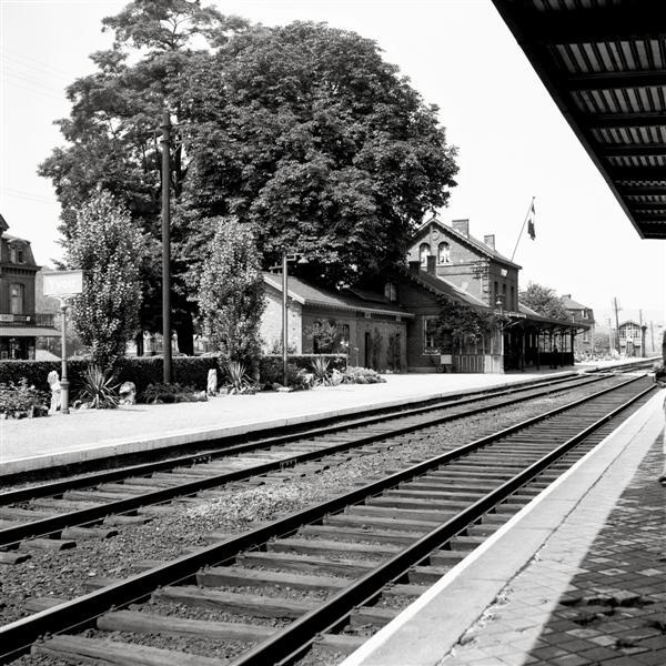 BeschrijvingDe foto toont de zij- en achtergevel van het voormalige station dat met luifels is uitgerust. Voor de verlichting van het perron worden elektrische lampen gebruikt. Op de achtergrond zien we het seinhuis.