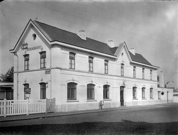 BeschrijvingDeze foto toont de voor- en zijgevel van het station. Links zien we een afsluiting bestaande uit betonnen elementen.