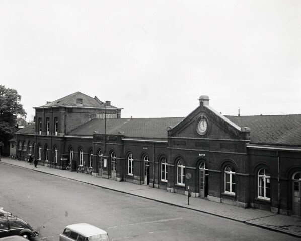 De foto toont de voorgevel van het station met een fronton waarin de stationsklok verwerkt is. Aan de overzijde van het gebouw staan auto's geparkeerd. Op het gelijkvloers zijn de ramen en deuren met rondboogvorm uitgevoerd.