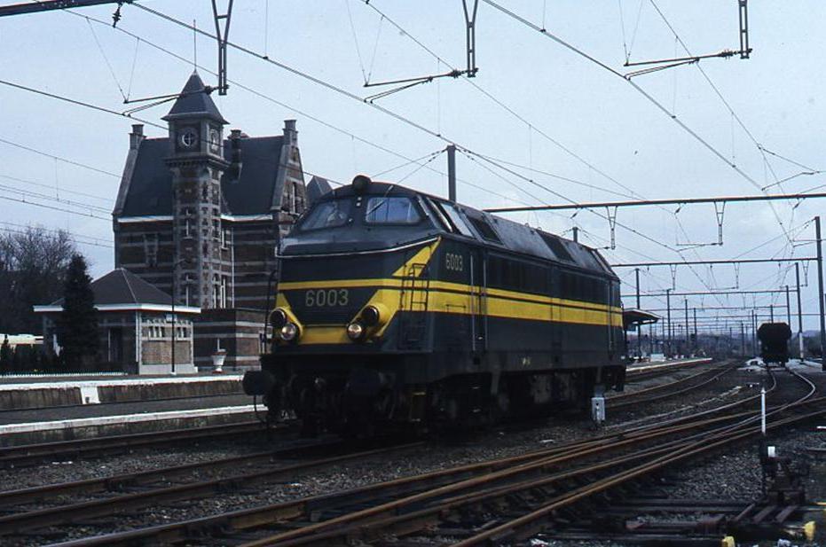 Deze fotogroep bevat zeven dia's. We zien een diesellocomotief van de reeks 60 proto in de bundel aan het station. Op de eerste twee beelden is het stationsgebouw met de perrons te zien. Op de volgende foto sleept de locomotief twee tremelwagens. Het laatste beeld toont de locomotief tijdens een rangeerbeweging. Schenking van Myriam Hendrickx.