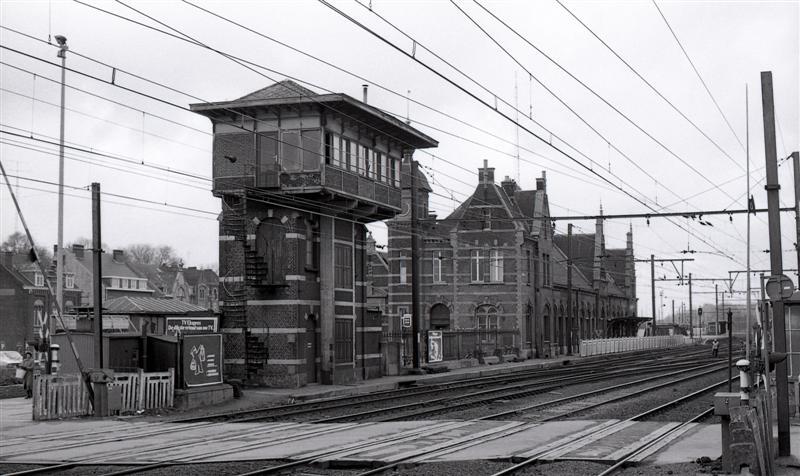 Direct achter de overweg zien we de voormalige blokpost, die de seinen van het station beheerde. Bemerk de draaitrap die toegang geeft naar deze blokpost. Daarachter staat het voormalige stationsgebouw.