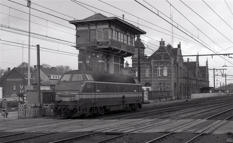 Deze locomotief behoort tot de reeks 62. Achter de locomotief zien we de voormalige blokpost die de seinen van het station beheerde. Daarachter is het oude station te zien. In de voorgrond een gesloten overweg.