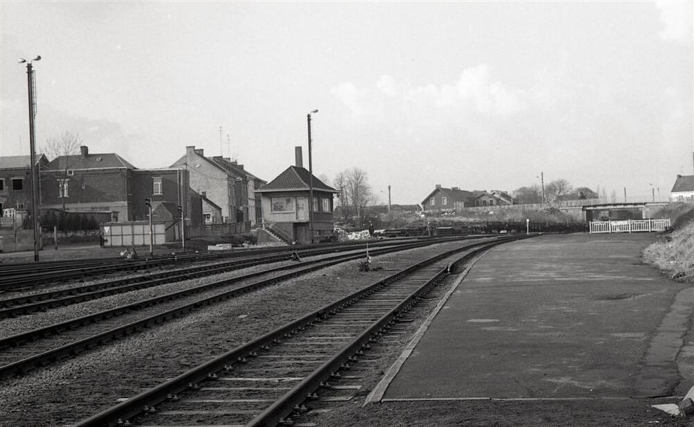 Centraal zien we een seinpost langs de sporen. In het linkse spoor, ongeveer in het midden, zien we een ontspoortong. Indien nodige laat deze ontspoortong, wanneer ze 'openligt' zoals te zien op de foto, spoorvoertuigen tegen lage snelheid ontsporen omdat de toegang tot dit spoor op dat ogenblik totaal niet gewenst is. Schenking van Myriam Hendrickx.