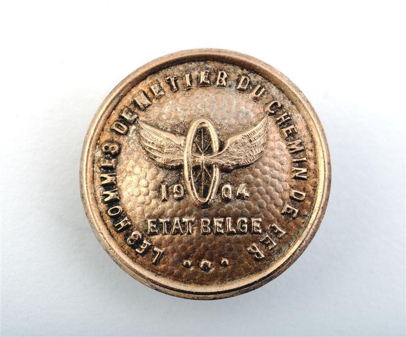 BeschrijvingOnder het wiel staat de datum 1904 en 'Etat belge' (Belgische Staatsspoorwegen). Over de omtrek 'Les hommes de metier du chemin de fer'.