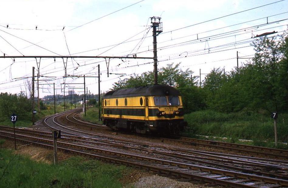 Een diesellocomotief reeks 59 rijdt op de splitsing van goederenspoorlijn 27 (Antwerpen - Brussel) en spoorlijn 36 (Brussel - Luik). Langs het spoor staan enkele kilometerpalen en lijnnummers.