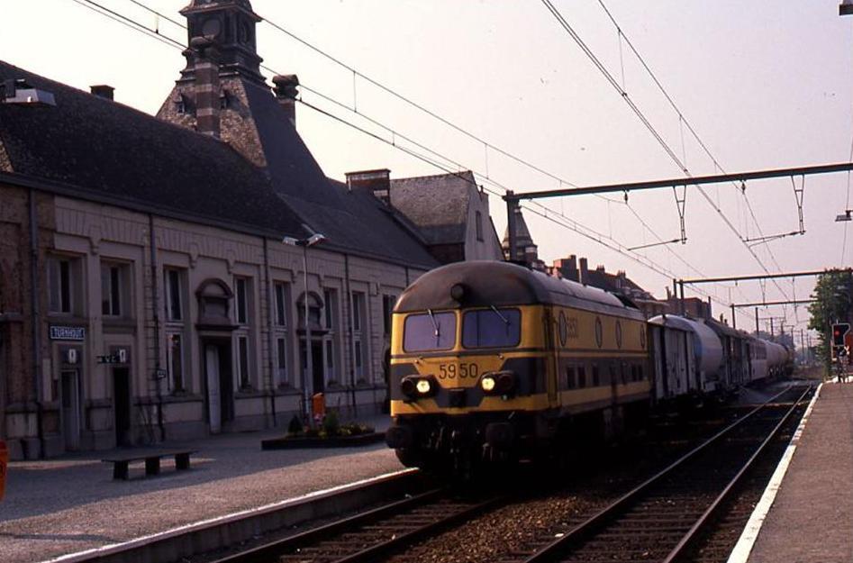 Deze fotogroep bevat vijf dia's. We zien een diesellocomotief van de reeks 59 met een onkruidverdelgingstrein in het station. Op de eerste foto zien we links het stationsgebouw met de perrons, een stationsnaambord en een zitbank. De tweede foto toont de trein langs de andere zijde. Schenking van Myriam Hendrickx.