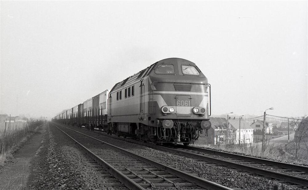 Deze locomotief behoort tot de reeks 60. Ze sleept een homogene goederentrein bestaande uit platte wagens met rongen. De wagens zijn beladen met containers.