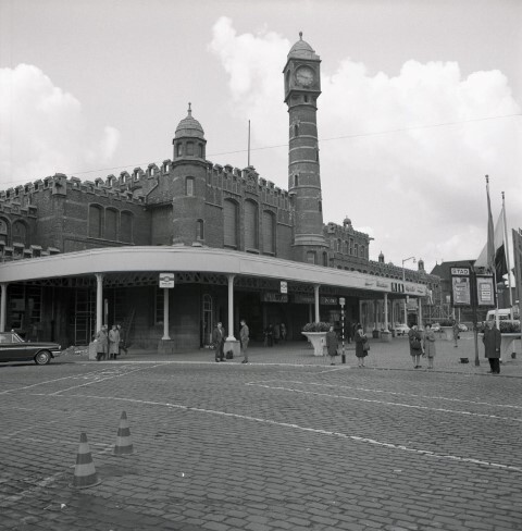 Deze fotogroep bestaat uit vier negatieven. De foto’s tonen de voor- en zijgevel van het neogotische station met zijn luifel, torentjes, kantelen en uurwerktoren. Ze werden genomen van op het Koningin Maria Hendrikaplein.
