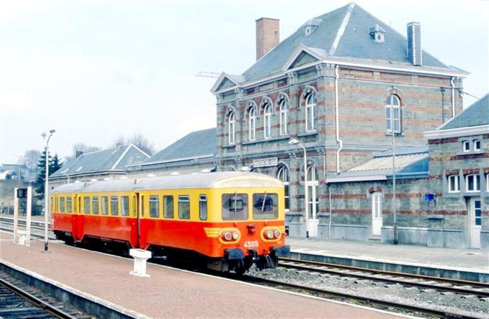 Deze fotogroep bevat 15 dia's. Een motorwagen van de reeks 45 staat in het station. Op het eerste beeld zien we het stationsgebouw, de perrons en de verlichting. De volgende foto laat het motorstel zien van de andere kant met op de achtergrond enkele gesloten goederenwagens. De laatste afbeelding toont het motorstel bij vertrek uit het station waarbij we een panoramisch beeld krijgen van de bundel en waarop een handbediende wissel te zien is. Schenking van Myriam Hendrickx.