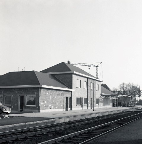 BeschrijvingDeze fotogroep bestaat uit drie negatieven. De foto's tonen het gebouw aan de kant van de sporen. Het station is van een luifel en onderdoorgang voorzien. Er worden werken uitgevoerd aan het stationsgebouw. Op de achtergrond zien we een passerelle over de sporen. Een rangeerlocomotief, vermoedelijk van de reeks 73, staat naast het perron opgesteld.