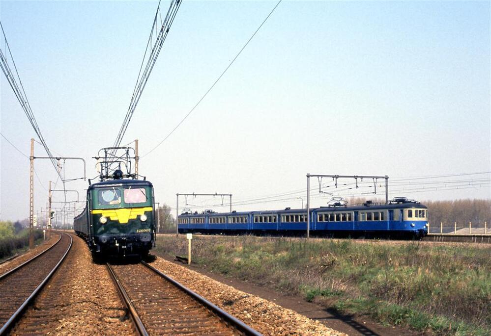 Deze fotogroep bevat vier dia's. De eerste foto toont de elektrische locomotief type 120 met een reizigerstrein samengesteld uit M 1-rijtuigen. Rechts zien we het elektrisch motorstel uit 1935 op een afgesplitste spoorlijn. Op de volgende beelden rijdt de elektrische locomotief type 101 op het rechtse spoor met een goederentrein. De sporen links zijn nog voorzien van de oude bovenleidingpalen uit 1935. Schenking van Myriam Hendrickx.