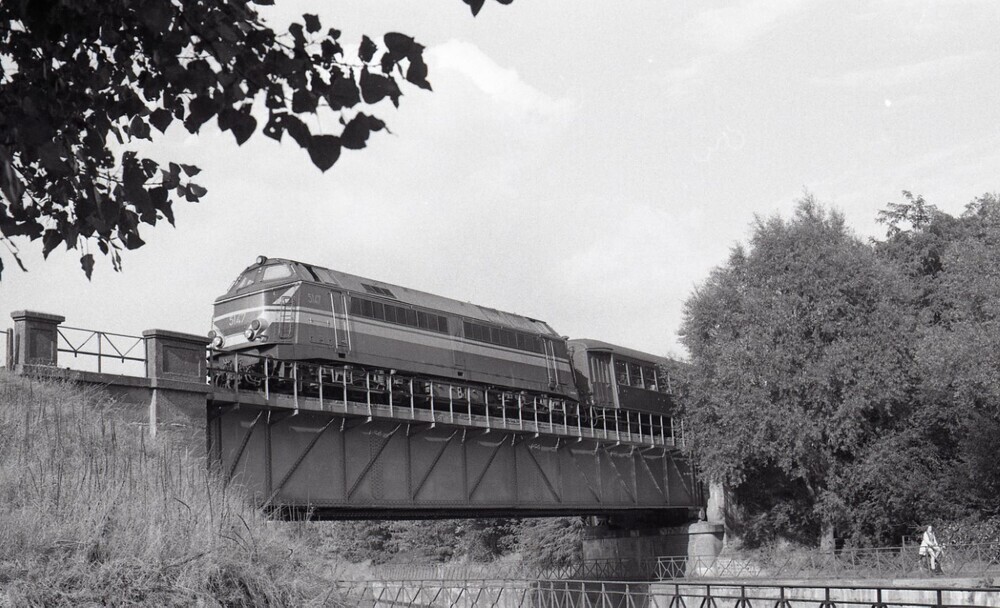 We zien diesellocomotief 5147 met een reizigerstrein in de omgeving van Halle. De locomotief rijdt juist over een metalen spoorbrug. De trein bestaat uit een sleep K-rijtuigen.