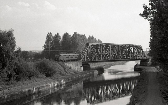 BeschrijvingElektrische locomotief 2343 rijdt als losse locomotief over een metalen spoorbrug in de omgeving van Halle.